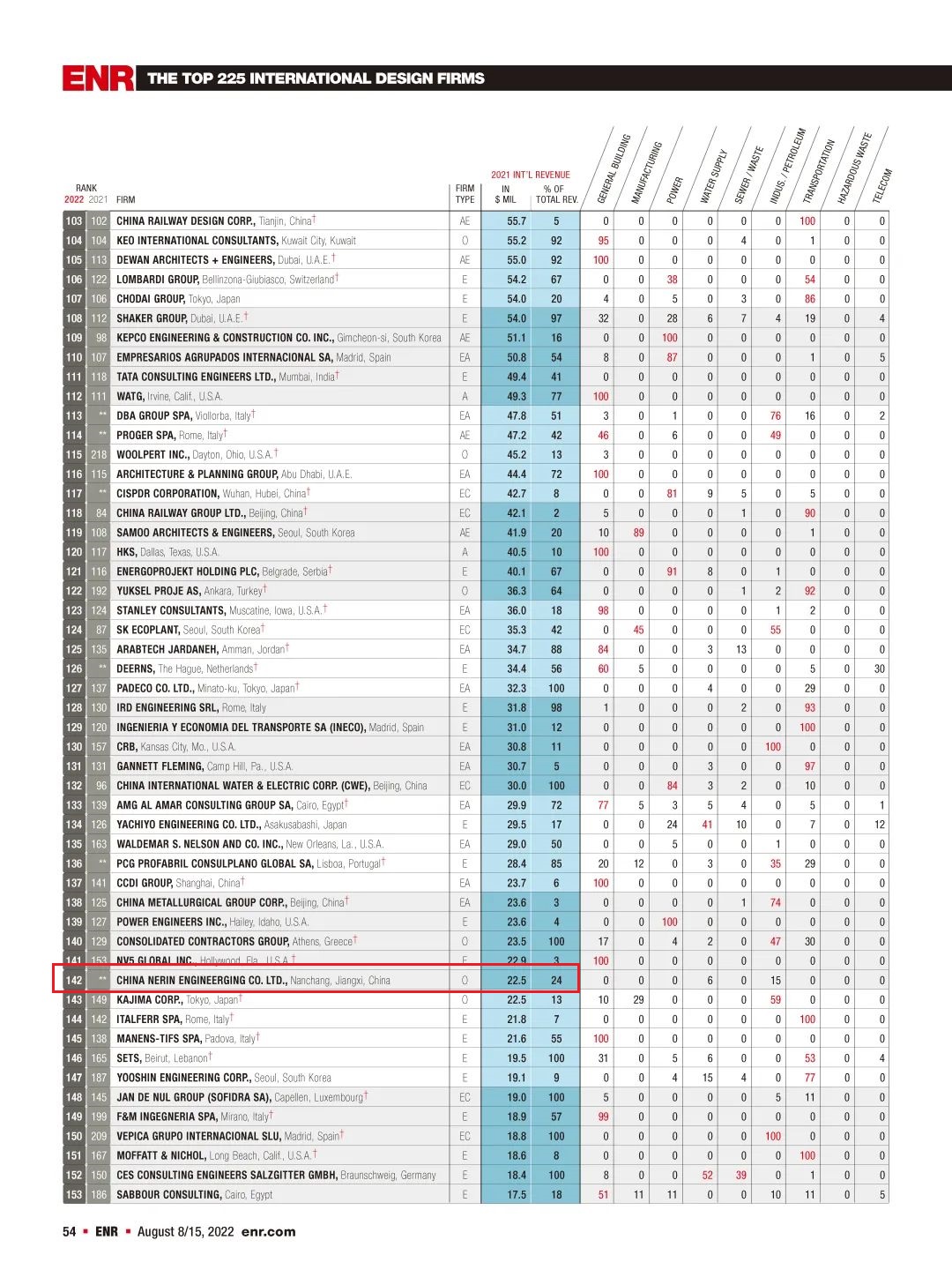 China Nerin Ranked Among ENR 2022 Top 225 International Design Firms