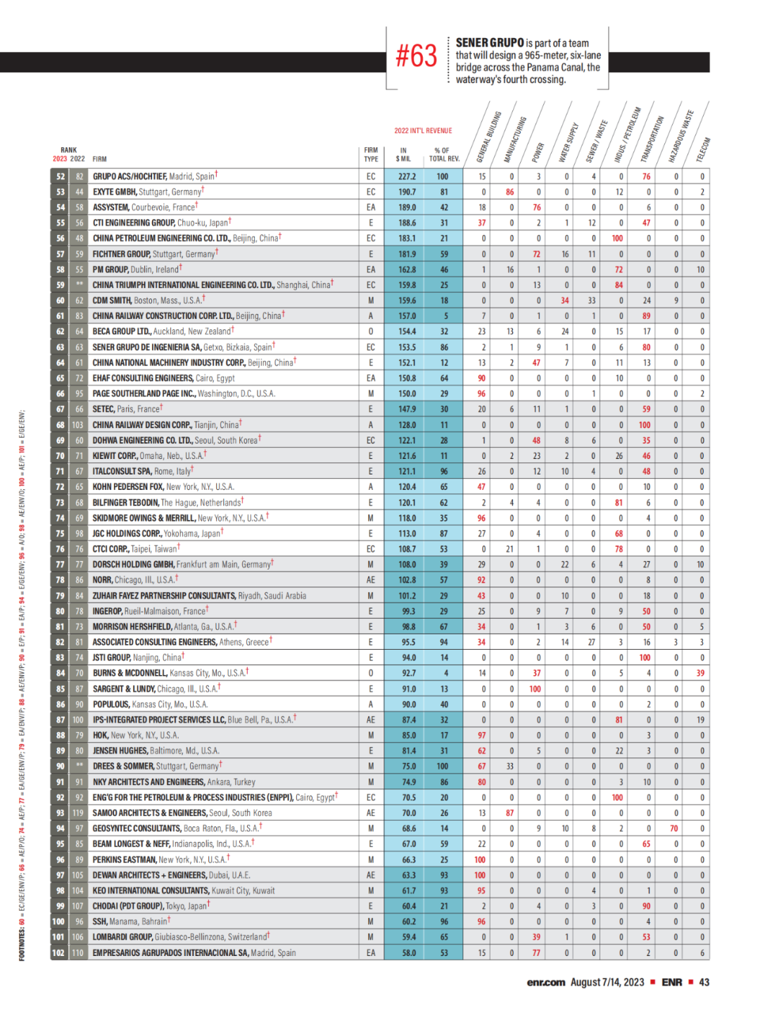 According to a news release by China International Contractors Association, Engineering News-Record (ENR) recently unveiled its Top 225 International Design Firms and Top 150 Global Design Firms rankings for 2023 a total of 23 companies from Mainland China have been listed in the Top 225 International Design Firms, and the number of listed companies is the same with that in 2022. Among them, China Nerin ranked 125th, rising 17 spots from its previous year's position.